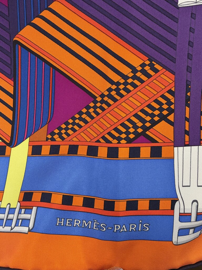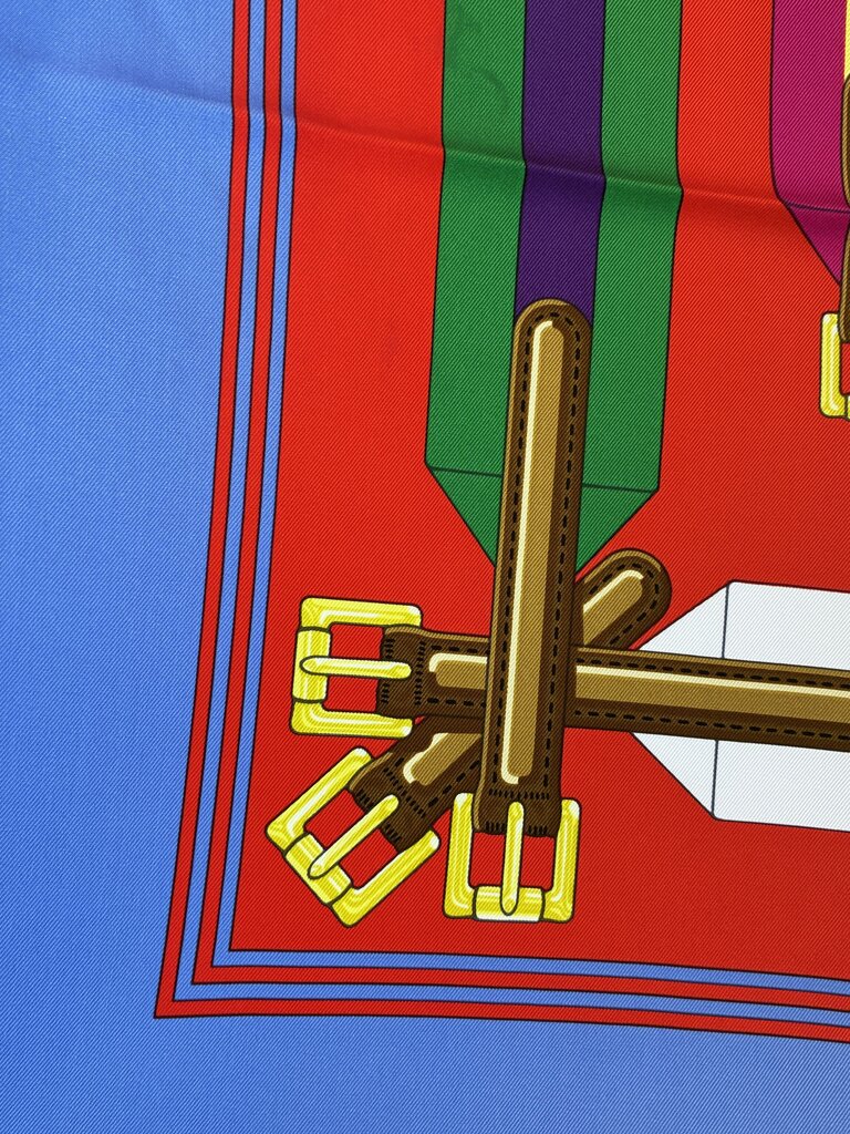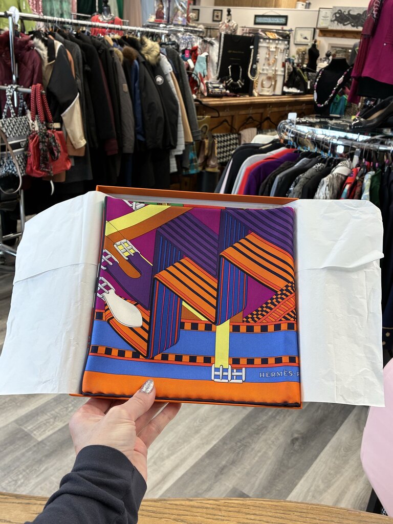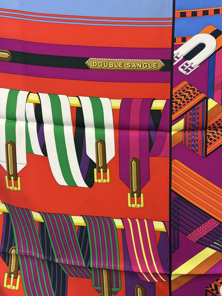 This is an authentic HERMES Silk Double Sangle Scarf 90 in Rouge and Bougainvillea. This beautiful 100% silk scarf is in perfect condition & features a stunning design of buckled straps. Comes with box, tissue & styling cards.